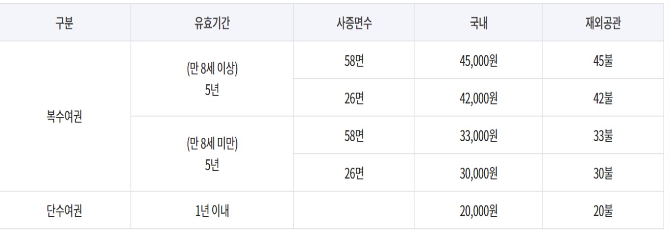 | 단수여권 | 1년이내 | 20,000원 |